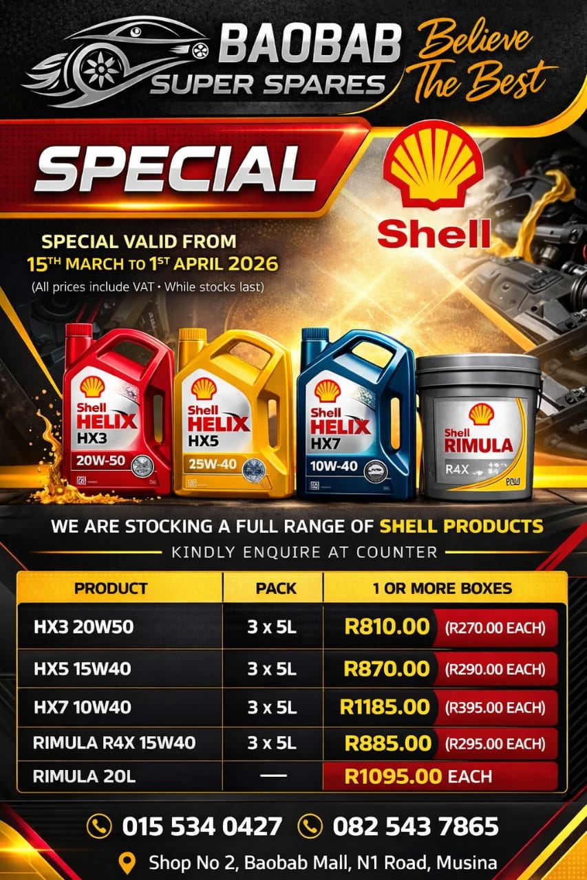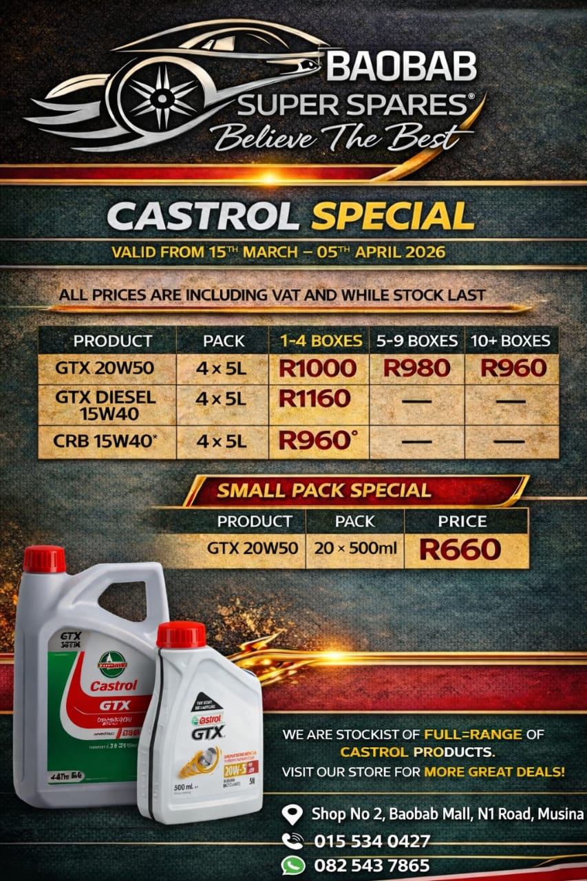 Baobab Super Spares is your one-stop supplier for all Japanese and South African automoti parts. Located in the town of Musina, approximatley 15km from the Beitbridge border.